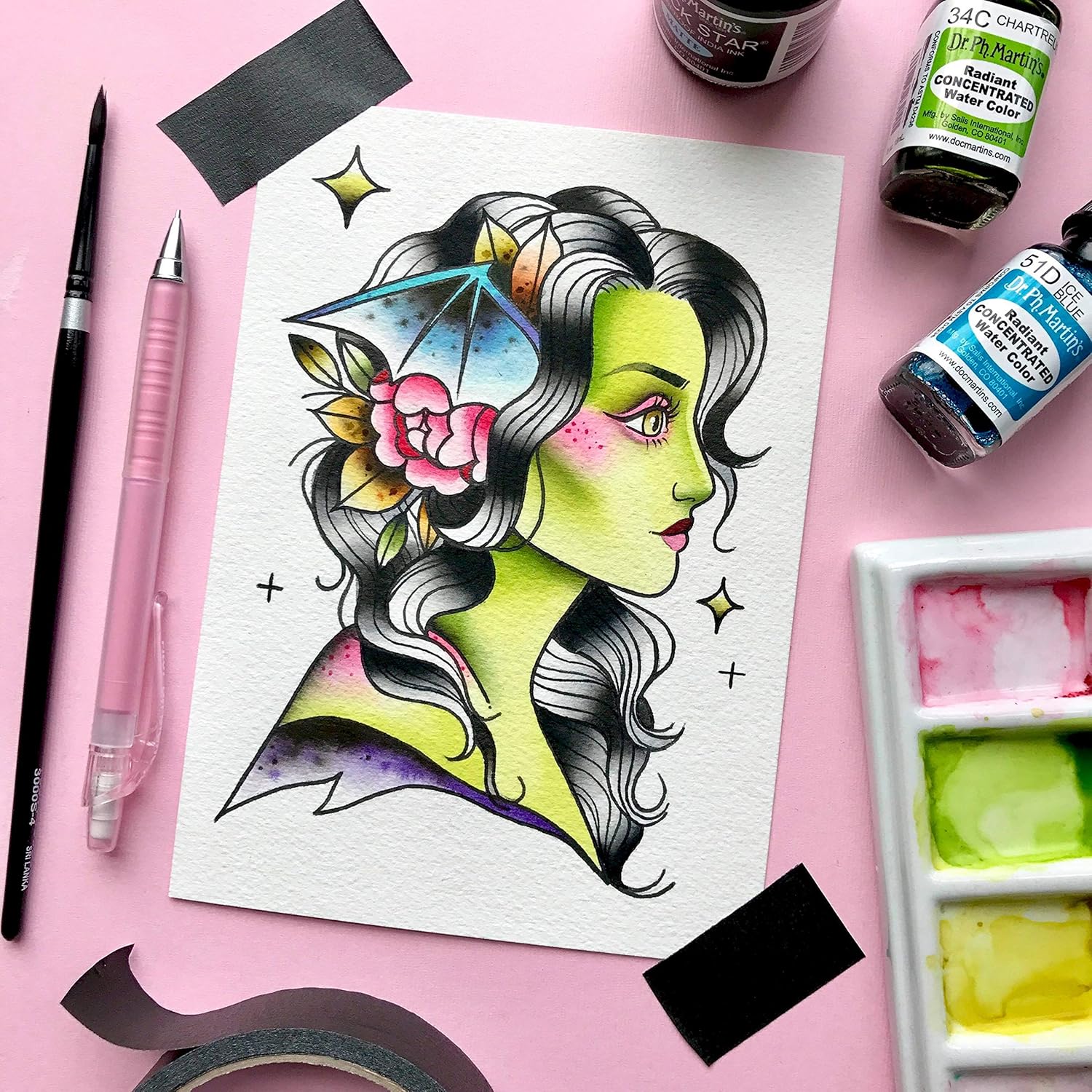 Horror Witch Lady Head Traditional Tattoo Flash Print By Michelle Kent