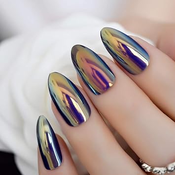 Quality Unicorn Chrome Fake Nails Gorgeous Yellow Blue Mirror Stiletto Full Cover Nail False With Adhesive Tabs 24 Ct